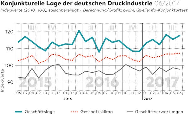 Dieses Stimmungshoch gründet auf einer positiveren Beurteilung der aktuellen Geschäftslage. Der entsprechende Index stieg vom Mai zum Juni 2017 um 2,2 %. Die vom ifo-Institut befragten Druckereien vermeldeten eine unveränderte Nachfragesituation sowie eine stabile Entwicklung ihrer Auftragsbestände.