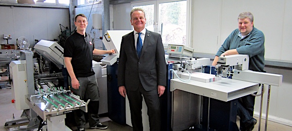 Überzeugt vom vollautomatischen Maschinenkonzept prestigeFOLD NET 52: Prokurist Carsten Stelzer (re.), Buchbinder Matthias Rudelsberger (li.), hier mit dem MB Bäuerle Vertriebsbeauftragten der Region Nord, Jens Jacobsen.