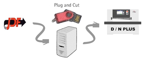 In der Druckvorstufe wird das digitale Bogenlayout in Form einer PPF- oder JDF-Datei abgespeichert. Diese Datei wird dann in den Hot-Folder abgelegt, welcher regelmäßig von Compucut GO geprüft wird. Sobald eine neue Datei erkannt wurde, wird diese von Compucut GO verarbeitet. Auf Basis einer fest definierten Anschnittsfolge wird das entsprechende Schneidprogramm erstellt und direkt in den Speicher der Maschine übertragen. Im Gegensatz zum normalen Compucut arbeitet die Version GO nur im Automatikmodus. Dieser automatisierte Workflow erfordert somit kein manuelles Eingreifen des Bedieners. So wird bei Compucut GO komplett auf eine entsprechende Bedienoberfläche verzichtet.