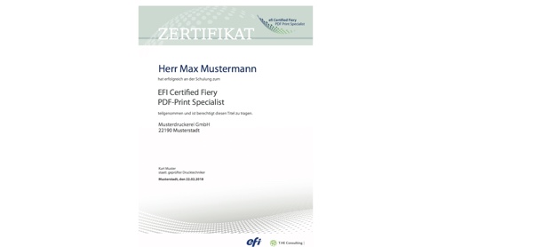 Dienstag 20. März 2018 - Der Verein PDFX-ready, St. Gallen/Schweiz, unterstützt die erst kürzlich von EFI Deutschland und T.HE Consulting vorgestellte Zertifizierung zum EFI Certified Fiery + PDF Print Specialist. EFI CF+PPS-zertifizierte Druck- und Medienbetriebe können zu Vorzugskonditionen Mitglied von PDFX-ready werden und damit kostenlos das gesamte Angebot des Vereins nutzen. PDFX-ready promotet den ISO-Standard PDF/X, der in der Druck- und Medienproduktion hohe Sicherheit und Effizienz ermöglicht, bereits seit 2005. Die EFI CF+PPS-Zertifizierung wurde von EFI Deutschland und T.HE Consulting für Digitaldrucker entwickelt, die ihre Drucksysteme mit Fiery Druckservern ansteuern und (Farb-)Einstellungen im Fiery-Colormanagement, in PitStop Pro sowie in Acrobat korrekt und stets reproduzierbar vornehmen wollen.