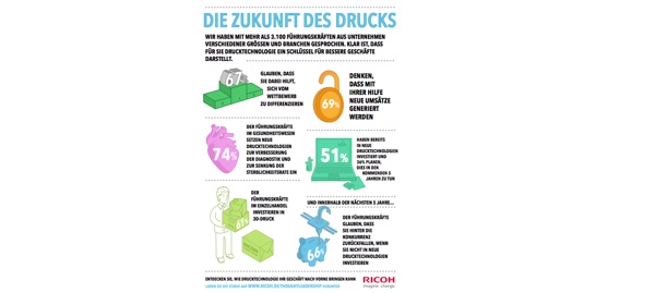 David Mills, CEO von Ricoh Europe, erklärt: „Die Aussage Printing is dead ist komplett fehlgeleitet. Neue Drucktechnologien unterstützen Unternehmen dabei, ihren Geschäftsbetrieb ganz fundamental zu verändern. Im Gesundheitswesen fertigen Pharmaunternehmen individuell auf Patienten angepasste Prothesen mittels 3D-Druck an. Im Einzelhandel stellen Händler Schuhe und einzigartige Druckdesigns auf Anfrage her und verringern so ihren Lagerbestand. In Schule, Ausbildung und Studium können Schüler und Studenten personalisierte Lehrbücher kaufen, was die Kosten senkt und das Lernen erleichtert.“