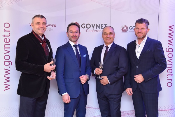 Dan Turcu (Ro Systec Group), Adrian Ion (GOVNET Romania), Neculai Mihai (FAN Courier Express) und Ing. Tomas Veigl (BÖWE SYSTEC Austria) bei der Verleihung der 6. Romanian Courier and Postal Business Awards (v.l.n.r).