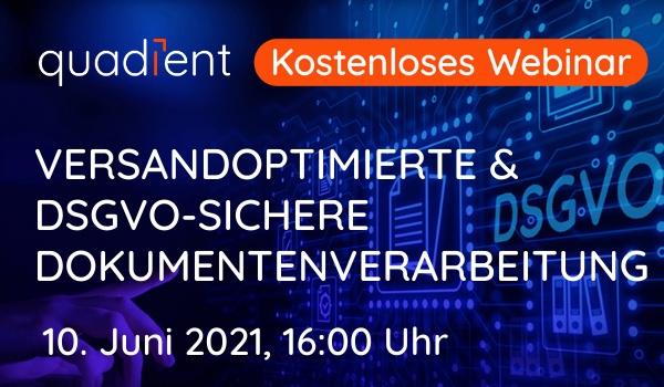 Im Live-Webinar „Versandoptimierte & DSGVO-sichere Dokumentenverarbeitung – Professionelle Lösungen für HighEnd-Kunden“, das am 10. Juni 2021 von 16:00 – 17:00 Uhr stattfindet, zeigen Ihnen die Quadient-Experten Martin Quante und Mathias Meyer anhand eines Kundenbeispiels interessante Möglichkeiten auf, wie Sie Ihre Prozesse passgenau optimieren, Effizienzpotenziale ausschöpfen und dadurch z.B. auch Wettbewerbsvorteile erzielen können. Und vor allem: wie und wobei Quadient-Systeme Sie bei der Einhaltung der DSGVO unterstützen.