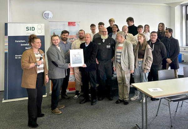 Carolin Sommerer und Alexander Bartel (SID) übergeben die neue PSO-Urkunde an Kai-Uwe Arnold (hauptverantwortlicher Lehrer an der B6, fünfter von links)